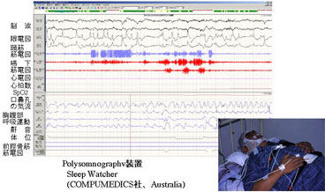 デジタル化された終夜睡眠ポリグラフ検査装置と検査風景